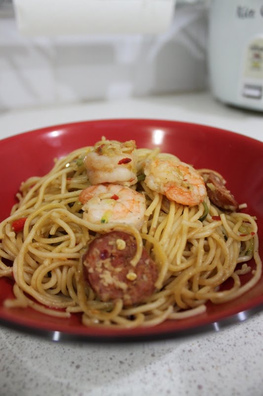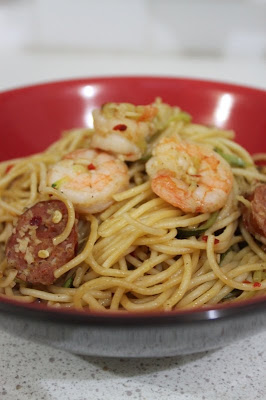 Garlic Chili Chorizo Prawn Zucchini Pasta.